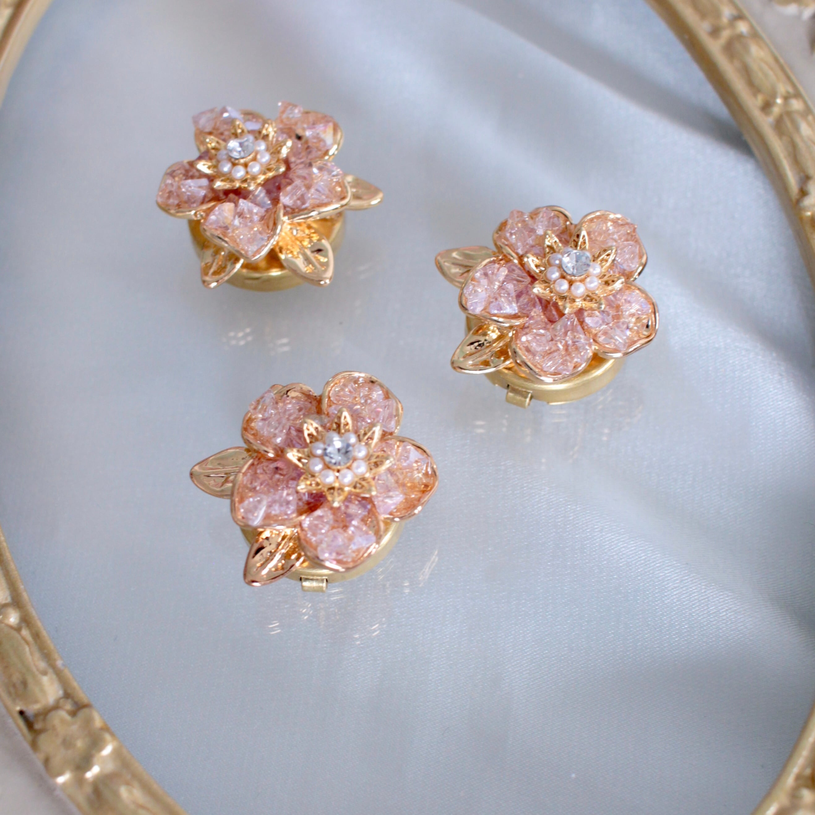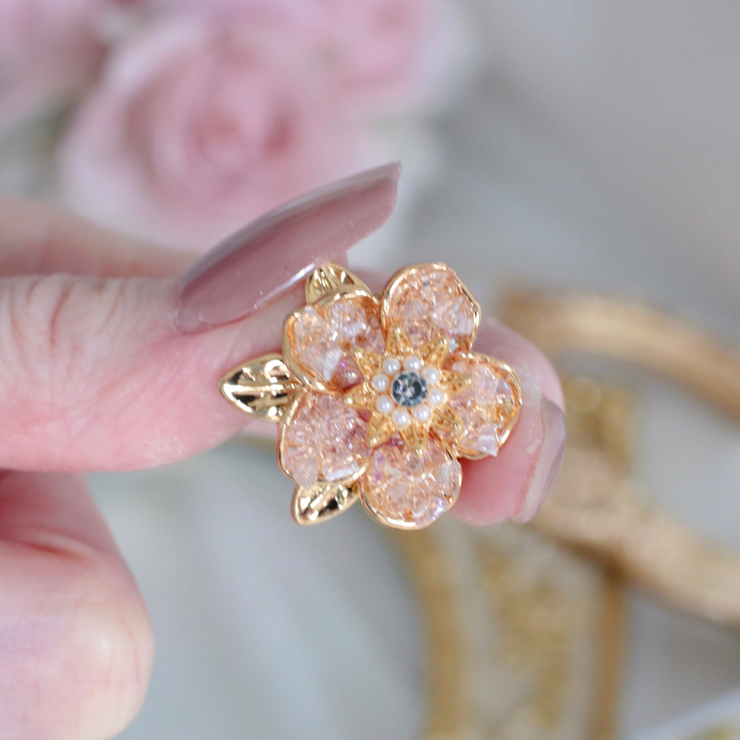さらに真ん中にはパールとアクリルのキラキラを添え、全体的に光り輝くお花をイメージしたパーツをボタンカバーに仕立てました。