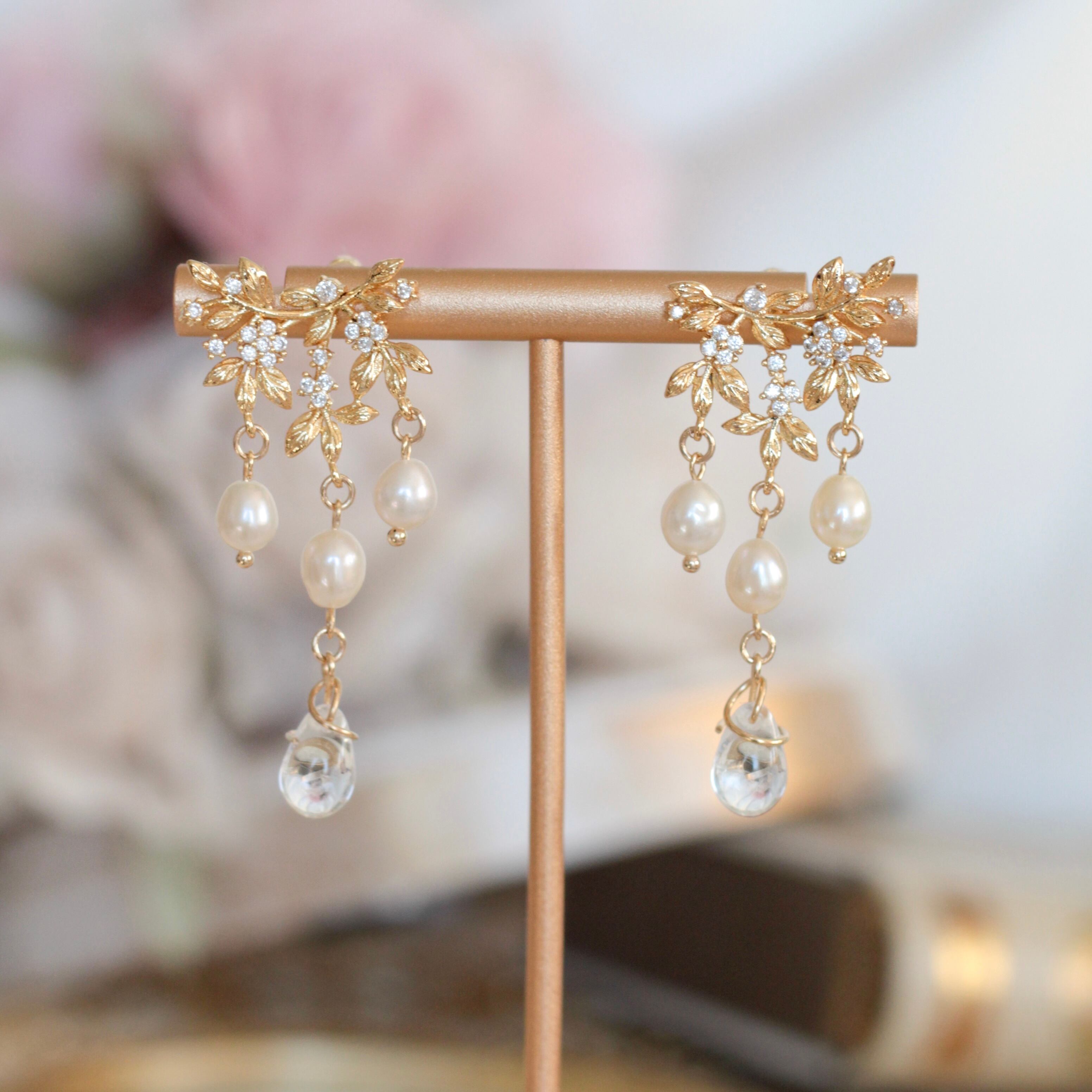 ほんのりとクリーミーなカラーの淡水パールを組み合わせ、グリアベージュのチェコビーズを垂らしたデザインの耳飾りです。