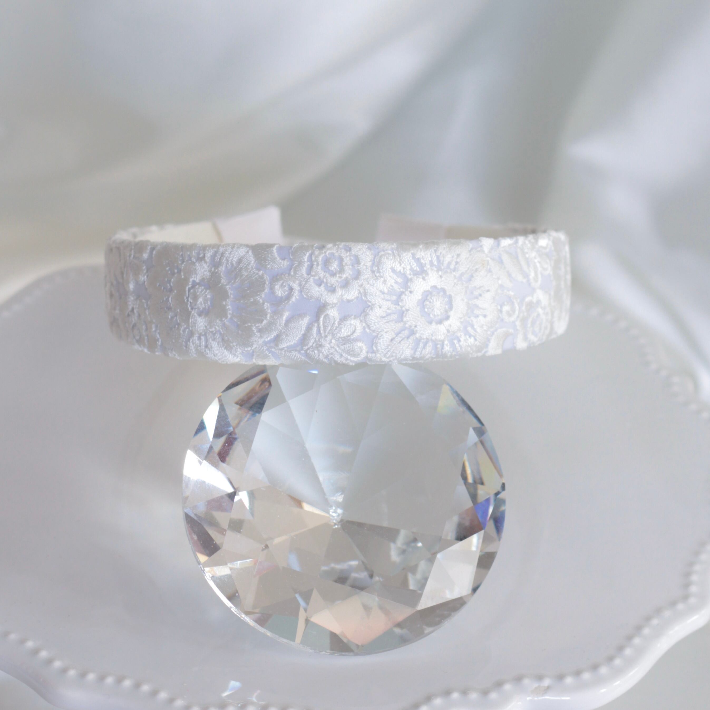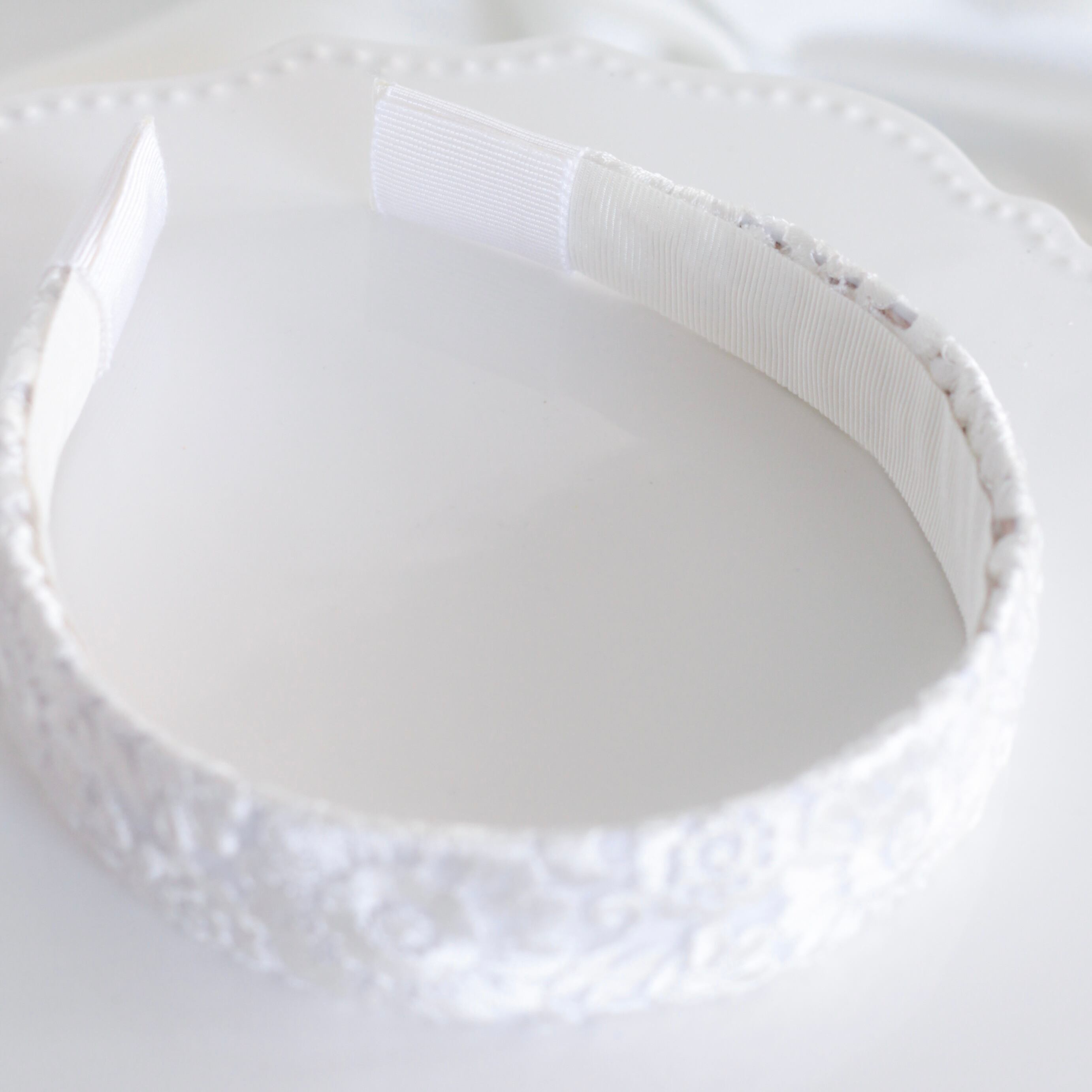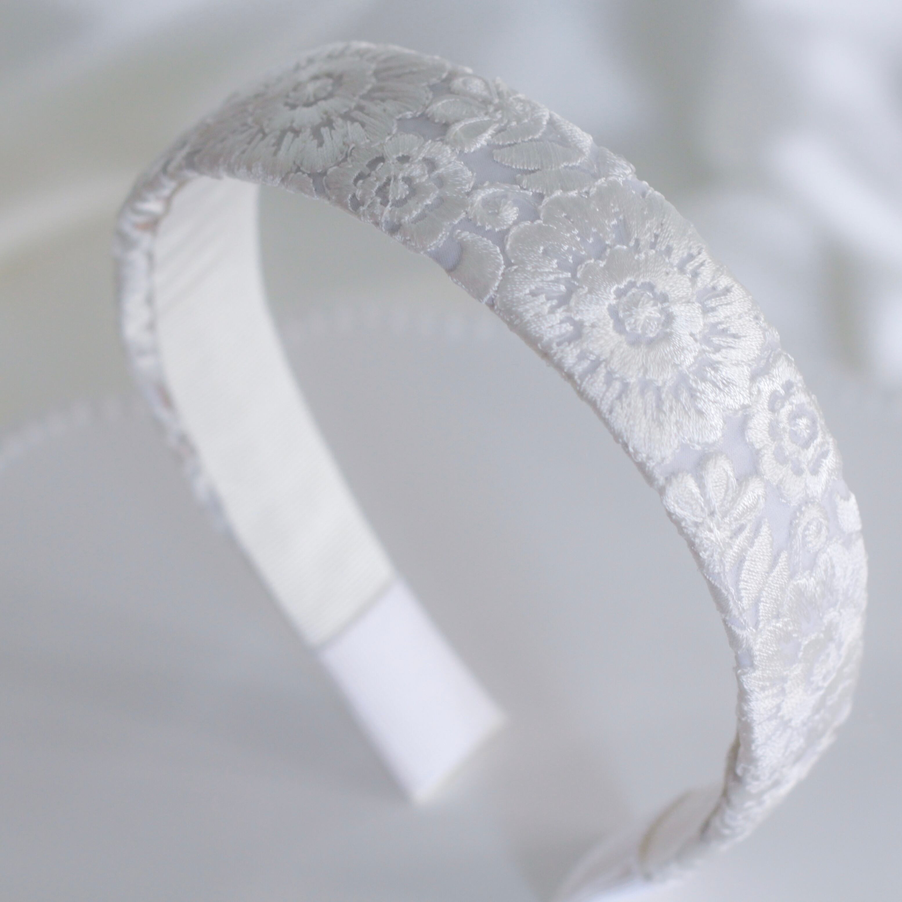 青みを含んだ真っ白なインド刺繍を生かすため、できるだけ白さの強いカチューシャ土台で美しいホワイトに仕上げました。