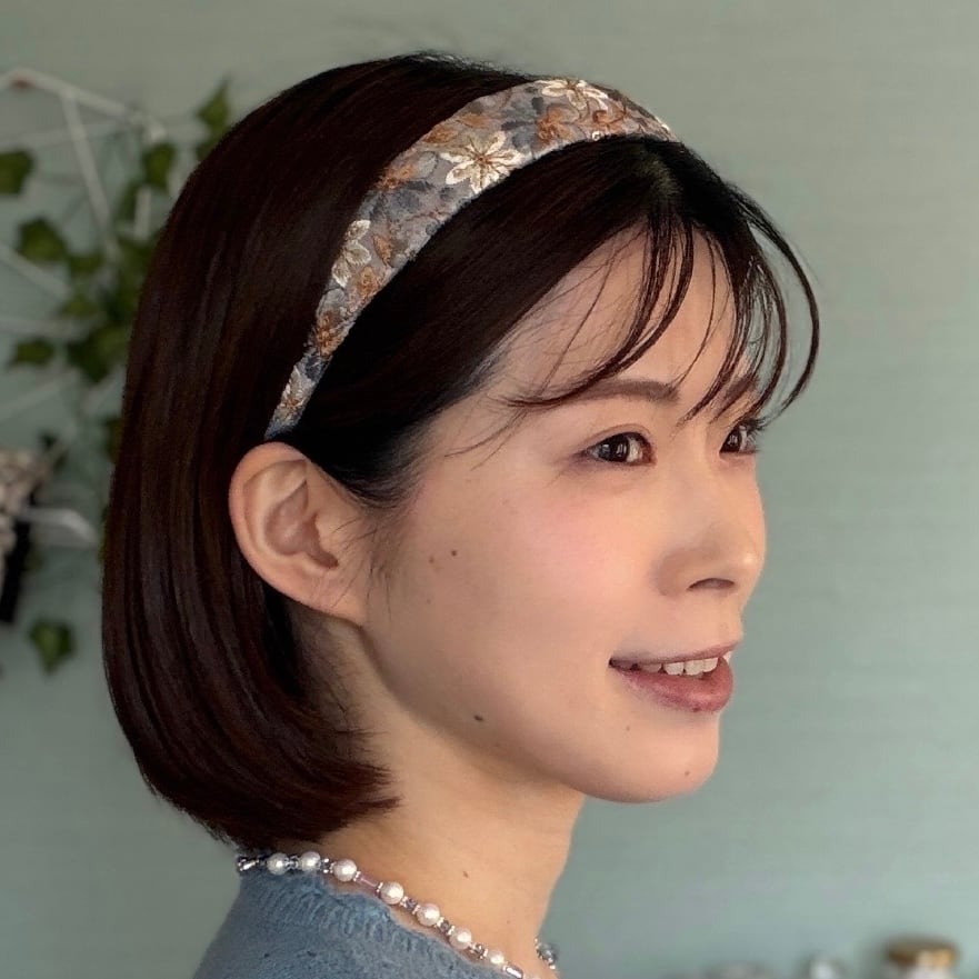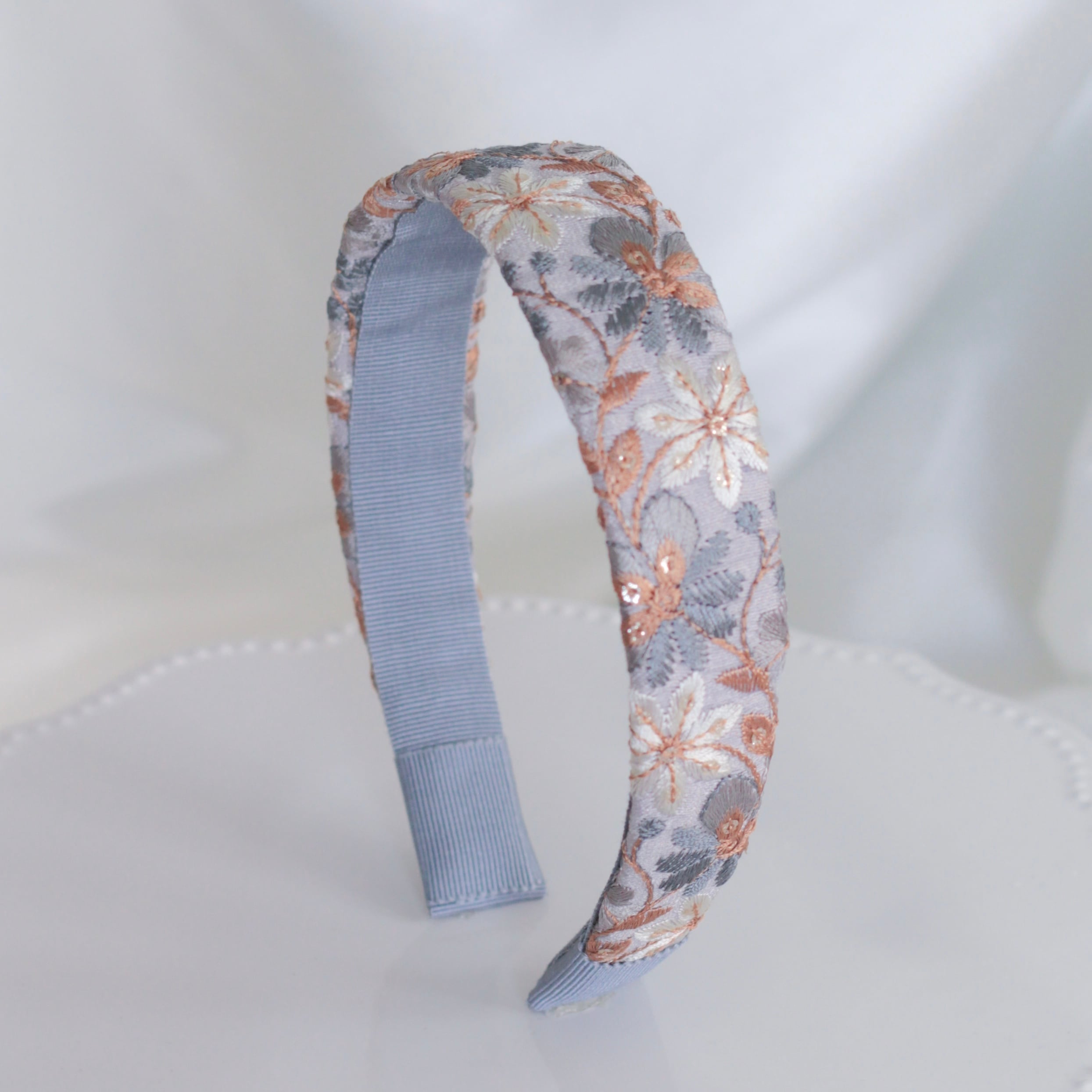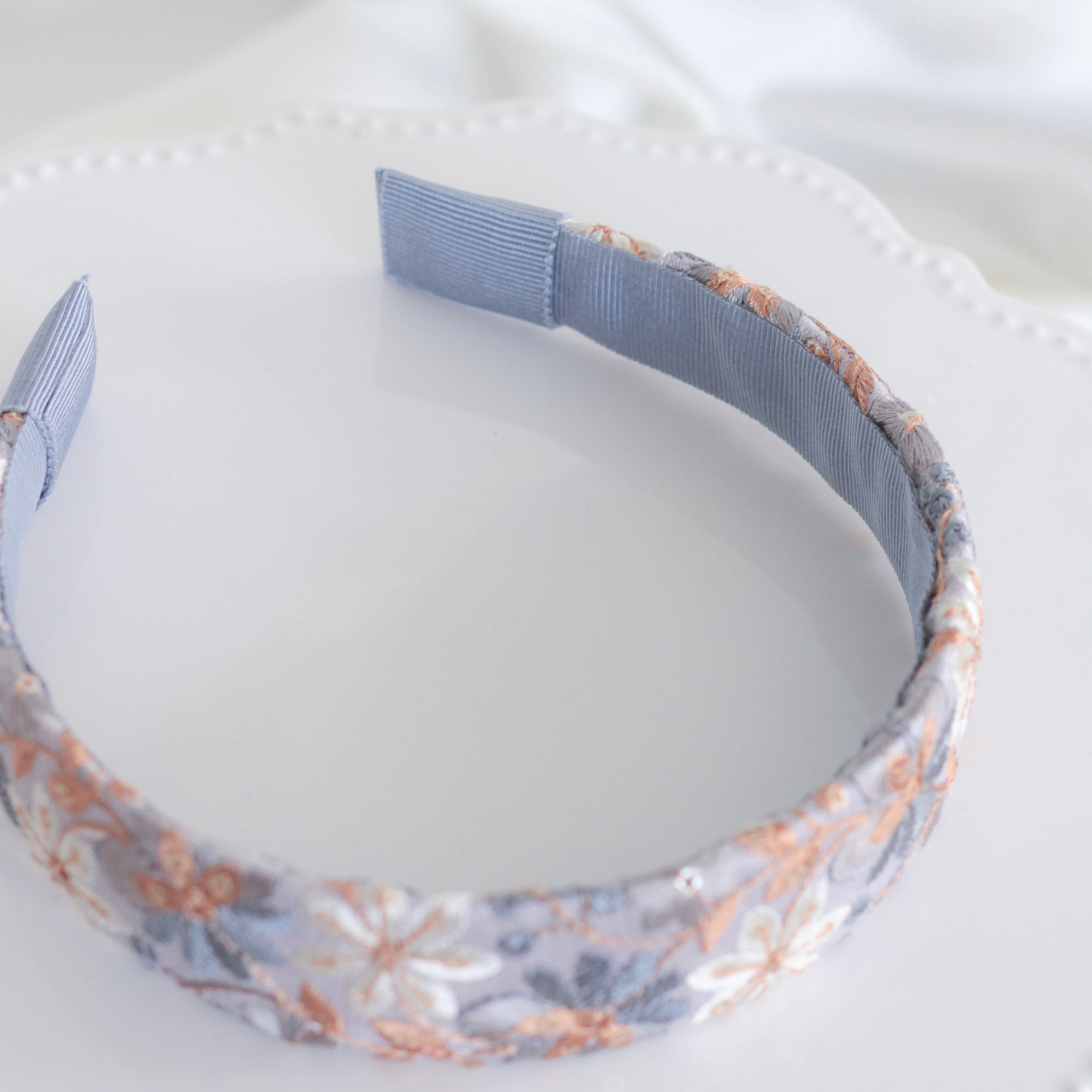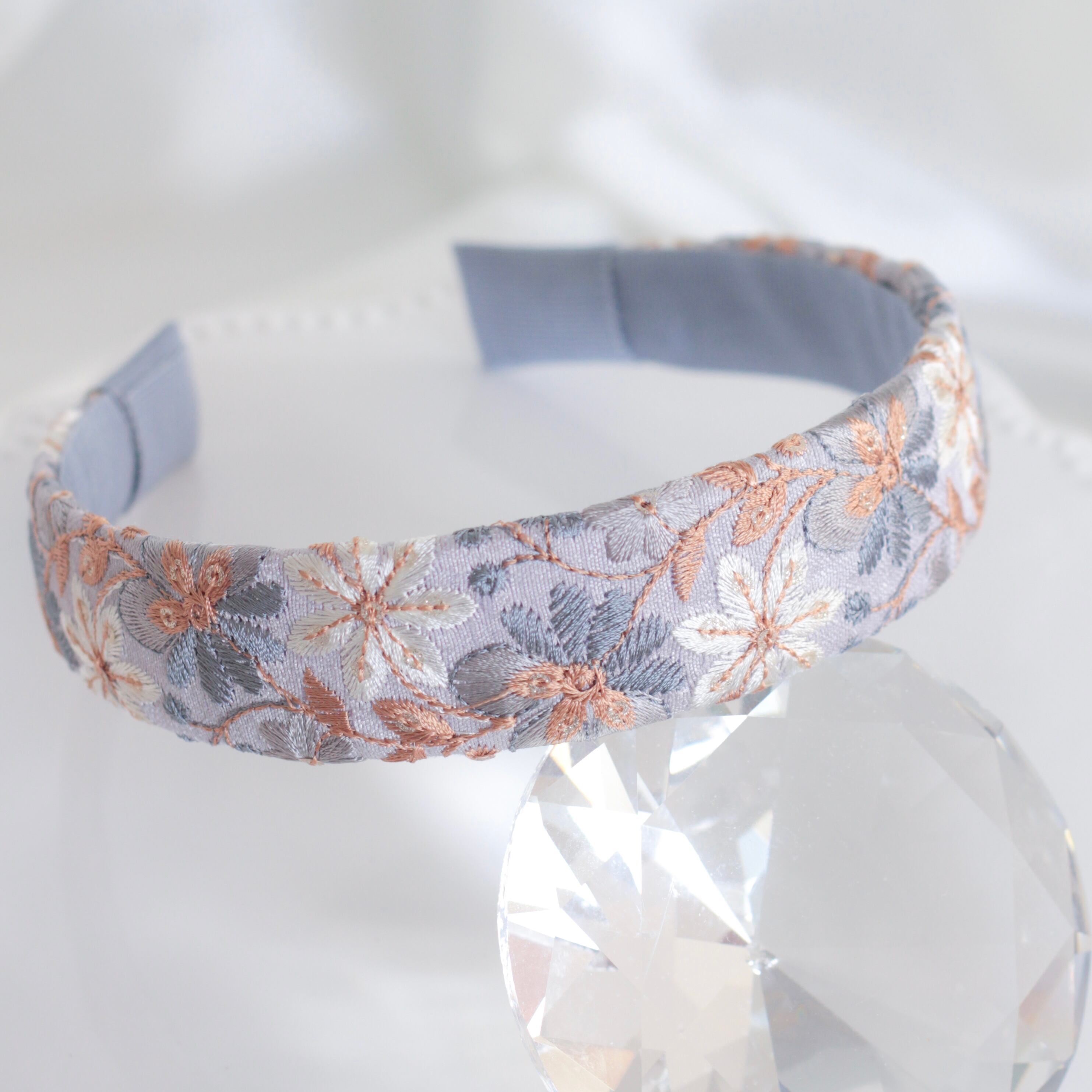 アイスグレーの土台にダスティブルーとブラウン、そしてホワイトをメインに使ったお花の模様が刺繍されたインド刺繍リボンを、落ち着いた雰囲気のカチューシャに仕立てました。